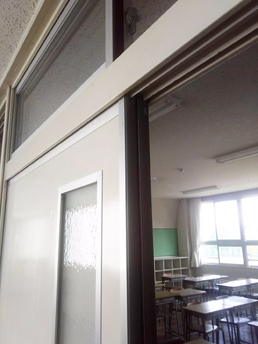 学校の間取りは、私たちの頃と変わらない南側に教室を配し北側にローカのある「片廊下形式」。だた違うのが間仕切りとなる壁の材料で、木材であったのが、工法も進みある頃から壁そのものをユニット化した「鋼製間仕切壁」になっている点です。教室に入る建具も鋼製で出来ています。今回も建具前後にある「戸当ゴム」の交換でした。