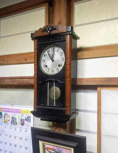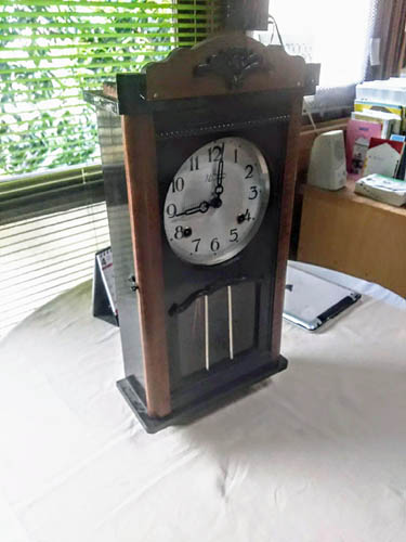 そんな折、片付けを見に行くと納戸の隅になつかしの「ボンボン時計」。いやぁ!何年納戸に隠れていたことでしょう。(およそ20年くらいか?)両親と妹たち、全員で寝ていた部屋に響くあの音を思い出します。実はこの時計、両親の結婚の際大工であった父の「親方」が贈ってくれた記念品なんです。