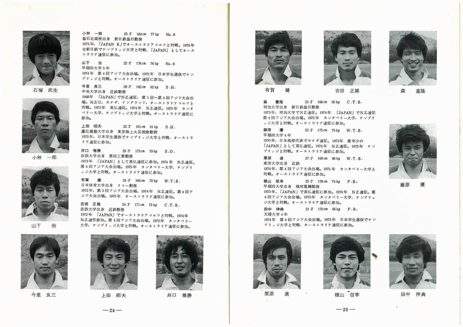 両チームの選手を改めて見ると様々な思いが浮かびます。ウェールズ キャプテン No.8 デービス氏、彼は医師であったような。フルバックのウィリアムズ氏、この頃の「イケメン」。日本チームをのぞくと 「いた いたぁ!」 という選手ばかりで。ロックの小笠原、フランカーの石塚、ウィングの藤原(後にプロレス界か?)、そしてフルバックの植山。ラグビー界の先人たちを久しぶりに思い浮かべ、気がつくと自主トレ以上の時間が過ぎていました。(W)