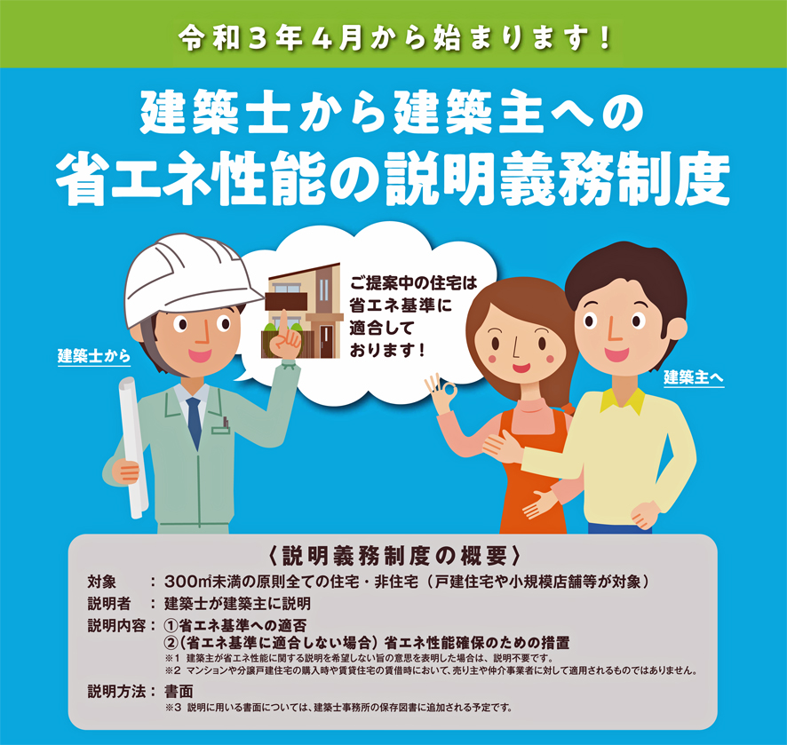 国も国際社会に向け温暖化対策として温室効果ガスの削減をかかげ、住宅分野も削減目標があり、私たちが出来ることは間違いの無い根拠を持った「省エネ住宅」を造ることだと考えています。この流れのなか来年(2021 R3)4月から建築士による「省エネ性能の説明義務制度」がスタートすることになったわけです。