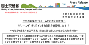 一定額のポイントを付与する制度。工事を R2 12/15 ~ R3 10/31 の間に契約した物件が対象です。ポイント申請は契約時の併行申請ではなくで 「完成報告」 という形で R4 4月まで期間があるので計画中や工事途中で検討できるのでご安心ください。