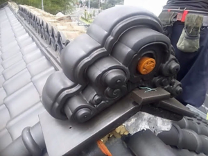 鬼瓦に付いているオレンジ色の部品はこのお宅の「家紋」。