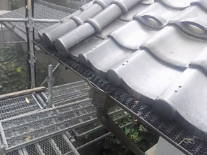 樋を掛け、ここも竹林の「落葉よけ」を取り付けてすべての作業が完了しました。