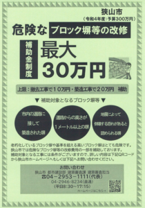 当地区 狭山市では4年前から公道に面する既存のブロック塀の改修工事に