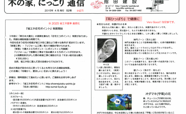 木の家,にっこり通信-522023年4月14日指田一利Sashida's Voices, 住まいるニュース 第52回 「木の家、にっこり通信」 (2015 = H27 04) (表面)… この投稿を見る→